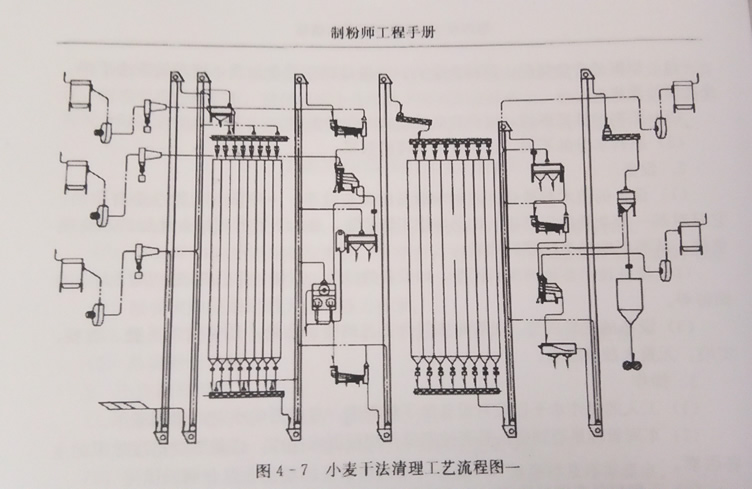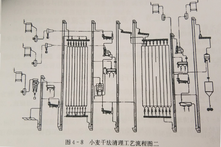 图4-7所示清理流程适合于对般小麦的清理,对杂质含量要求较低。同时,也是投资较省的清理工艺。若原粮含杂种类和数量较多,上述工艺就不能满足清理效果的要求。